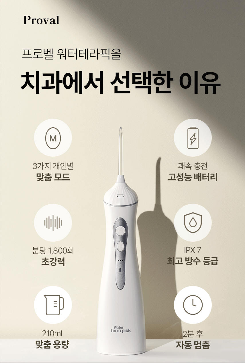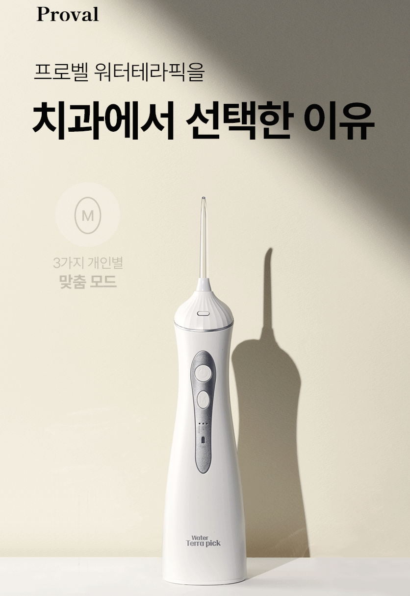 워터테라픽 구강세정기는 국내 구강 케어 브랜드인 프로벨(Proval)에서 출시한 코드리스 휴대용 구강세정기로, 치과 및 약국 유통망을 통해 판매되며 사용자 중심의 기능성과 디자인으로 주목받고 있습니다.