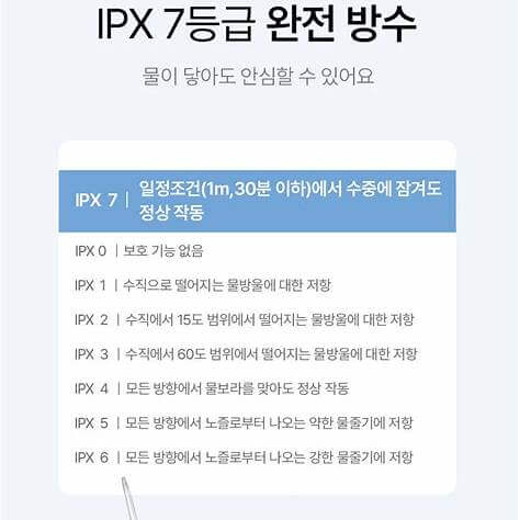 - 방수 등급: IPX7 등급으로 욕실 사용에 적합